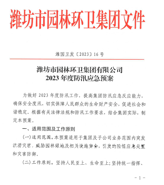 為做好2023年度防汛工作,提高集團(tuán)公司防汛應(yīng)急反應(yīng)能力,確保安全度汛。根據(jù)濰坊市城市防汛辦公室《關(guān)于全面做好2023年度城市防汛工作的通知》(濰汛辦字〔2023〕3號(hào))要求,結(jié)合集團(tuán)公司實(shí)際,集團(tuán)公司制定印發(fā)了《濰坊市園林環(huán)衛(wèi)集團(tuán)有限公司2023年度防汛應(yīng)急預(yù)案》(濰園衛(wèi)發(fā)〔2023〕16號(hào))。