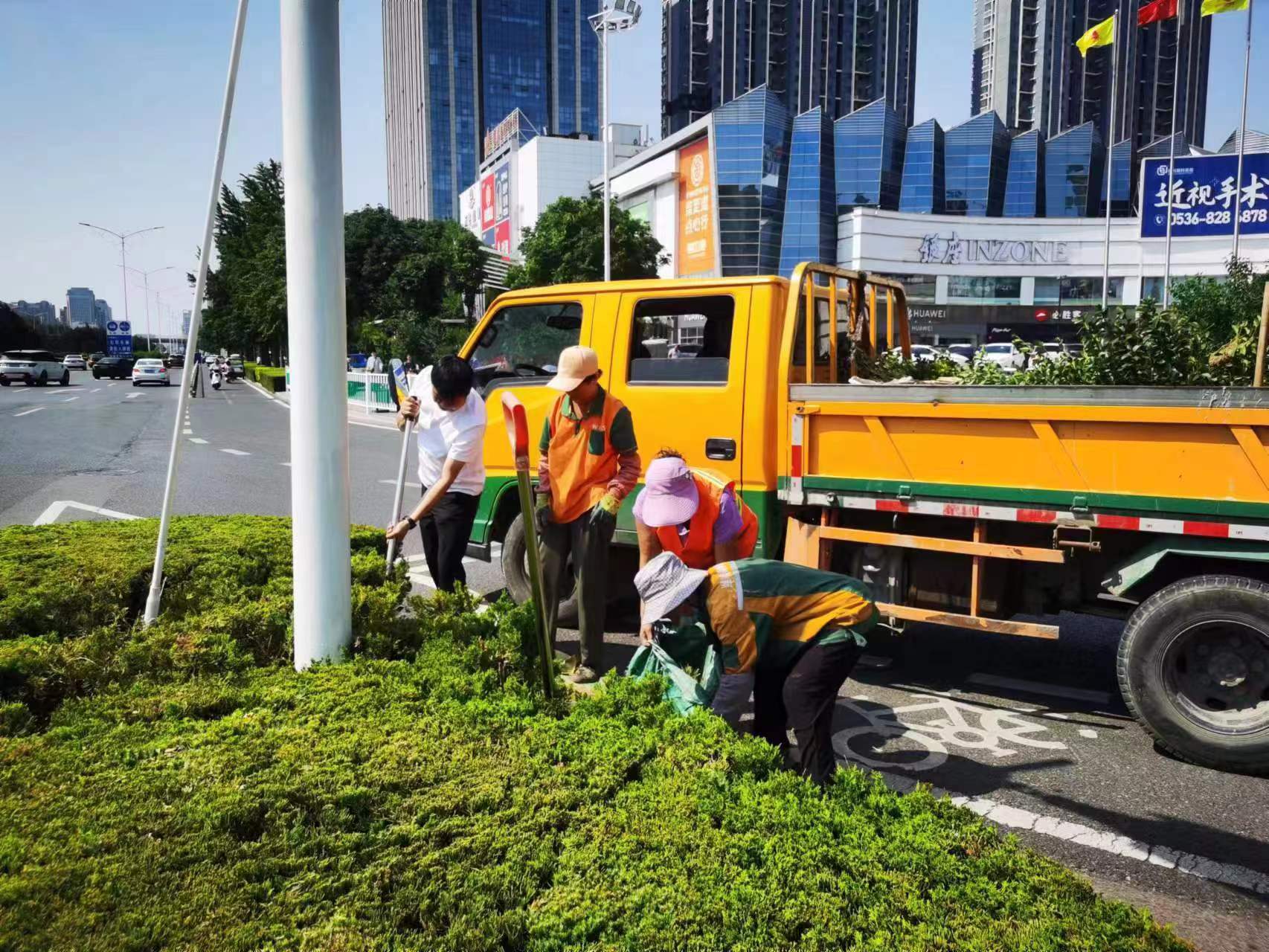 在北海路,對(duì)管轄道路進(jìn)行升級(jí)版的精細(xì)化管理,充分展現(xiàn)北海路綠化景觀效果,樹立道路精細(xì)化管理的標(biāo)桿。共出動(dòng)人員70余人,精細(xì)化修剪:對(duì)接白蠟16株,分車帶模紋1540㎡,墻基地被模紋3.3萬(wàn)㎡,花喬木87540株,草坪765㎡,雜草清理11萬(wàn)㎡、清理死樹干枝120余株;栽植:雞冠花200株、金葉女貞25株,扶芳藤165株;出動(dòng)機(jī)械:綠籬機(jī)10臺(tái),割灌機(jī)4臺(tái),油鋸1臺(tái),垃圾清運(yùn)車8臺(tái);道路作業(yè)期間,設(shè)置安全錐等措施,避開上下班高峰時(shí)段,避免造成主干道交通擁堵情況,確保施工安全。