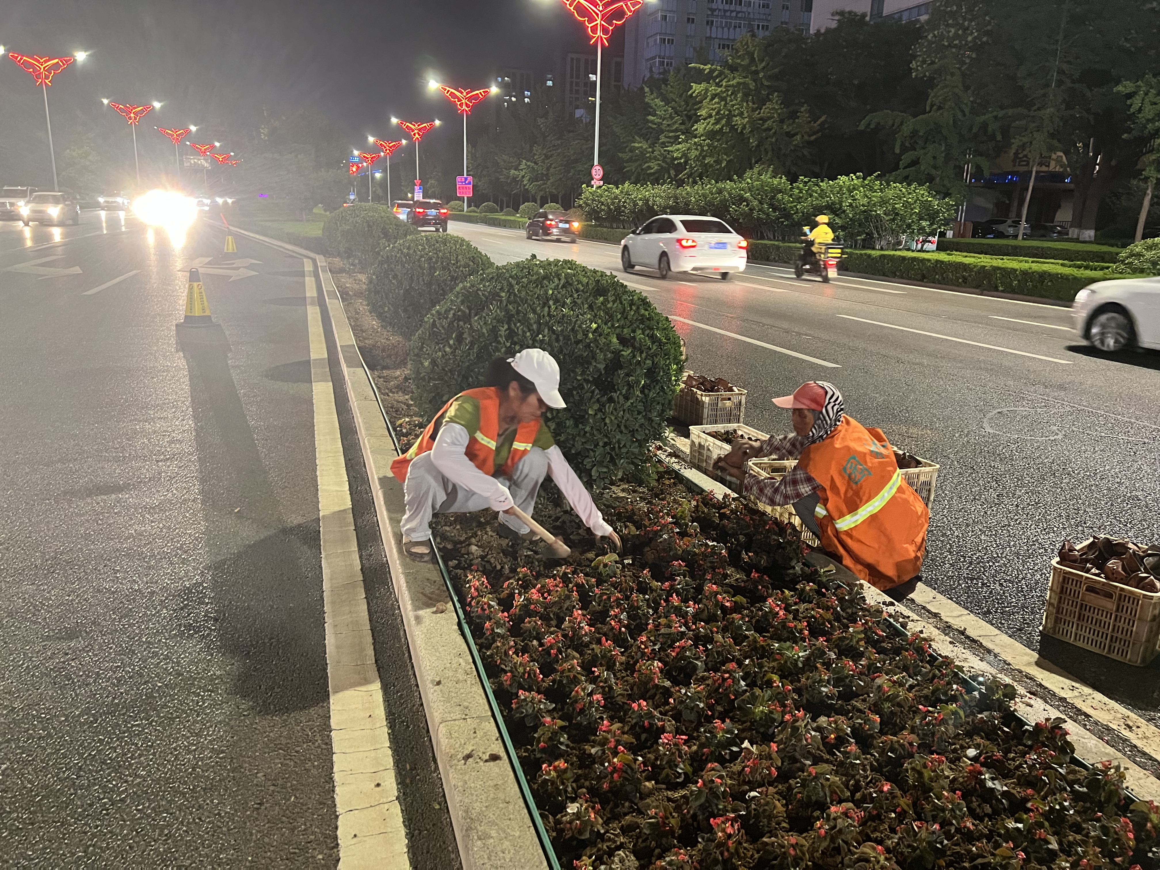 在市容市貌秩序整治行動(dòng)期間,市園林環(huán)衛(wèi)集團(tuán)充分發(fā)揮園林環(huán)衛(wèi)專業(yè)優(yōu)勢(shì),聚焦為市民群眾辦實(shí)事、辦好事,踐行初心使命,展現(xiàn)國(guó)企擔(dān)當(dāng),踐行“關(guān)鍵時(shí)刻站得出來(lái)、危急關(guān)頭豁得出去”的初心使命,在園林綠化、環(huán)境衛(wèi)生等城市管理服務(wù)領(lǐng)域中當(dāng)先鋒、打頭陣。為進(jìn)一步提升北海路的顏值和品質(zhì),怡景公司對(duì)北海路進(jìn)行夏季草花更新栽植工程。竣工時(shí)間緊迫、日間氣溫高、北海路交通壓力大,都是擺在怡景公司北海路項(xiàng)目組面前的嚴(yán)峻考驗(yàn),怡景公司北海路項(xiàng)目組迅速行動(dòng),制定詳盡的施工計(jì)劃,為提高草花栽植成活率,避免新栽植花卉遭受日灼傷害,同時(shí)避開(kāi)上下班高峰,減緩交通壓力,于17、18日夜間圓滿完成了栽植任務(wù)。