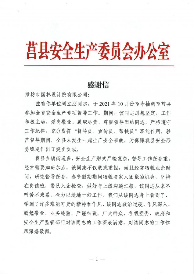 近日,濰坊市園林環(huán)衛(wèi)集團有限公司權屬子公司濰坊市園林設計院有限公司(以下簡稱園林設計院)收到莒縣安全生產委員會辦公室發(fā)來的感謝信,感謝園林設計院在全省安全生產專項......【點擊詳情】